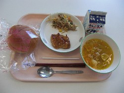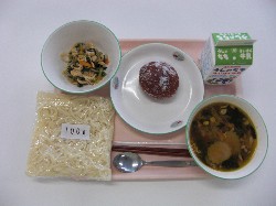 中華めん、牛乳、しょうゆラーメン 揚げパン(黒糖パン)、油揚げと野菜の和え物 ![]() |