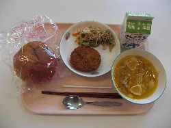 子どもパンスライス、牛乳 シェルマカロニと野菜のスープ メンチカツ、ごぼうサラダ ![]() |