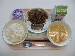 ごはん、牛乳、呉汁 さんまの生姜煮、鶏ごぼう丼の具 ぶどうゼリー ![]() |