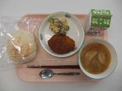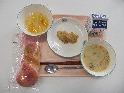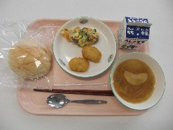 メロンパン、牛乳、ラビオリスープ チキンナゲット(焼)、さつまいもサラダ ![]() |