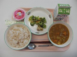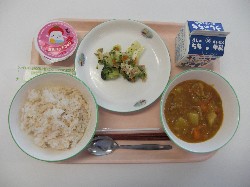 麦ごはん、牛乳、米粉ポークカレー バジル風味のサラダ、豆乳パンナコッタ ![]() |