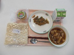 地粉うどん、牛乳、肉汁うどん 鶴茶ん、小松菜のごま炒め ![]() |