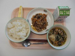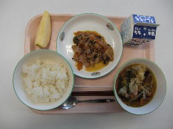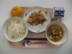 ごはん、牛乳、さつま汁 すきやき煮、みかん、わかめふりかけ ![]() |