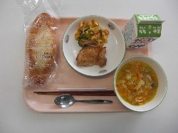 ごはん、牛乳、鶏肉とさつまいもの旨煮 揚げぎょうざ、ほうれんそうと白滝のナムル ![]() |