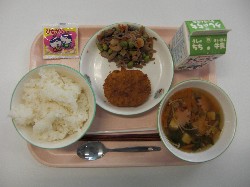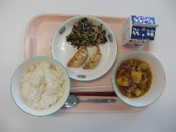 ごはん、牛乳、さつまいものみそ汁 あじさんが焼き(揚げ) 大豆とひじきの煮物 |