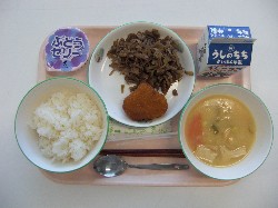 ごはん、牛乳、呉汁 焼き栗コロッケ、鶏ごぼう丼の具 ぶどうゼリー ![]() |