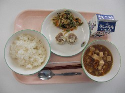 ごはん、牛乳、マーボ豆腐 県産黒豚揚げぎょうざ、ナムル ![]() |