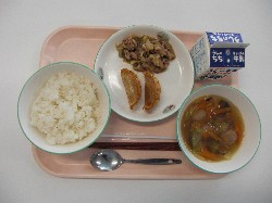 ごはん、牛乳、白菜と肉団子のスープ 県産黒豚揚げぎょうざ、ホイコーロー ![]() |