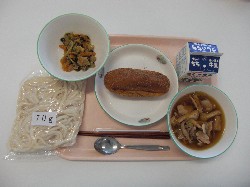 地粉うどん、牛乳、肉汁うどん キャラメル揚げパン、小松菜のごま炒め ![]() |