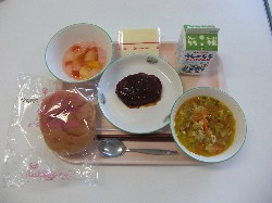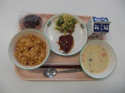 | チキンライス、牛乳、ドリア風ソース ハートのハンバーグ、イタリアンサラダ 豆乳プリン ![]() |