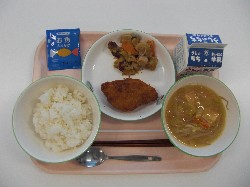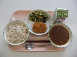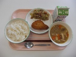 麦ごはん、牛乳、チキンカレー 野菜コロッケ、小松菜とわかめのサラダ |