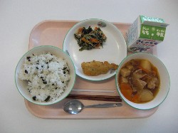 わかめごはん、牛乳、肉じゃが あじフリッター、ほうれんそうのごま和え ![]() |