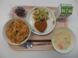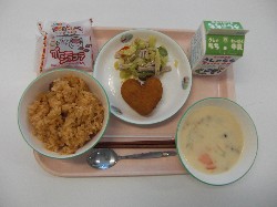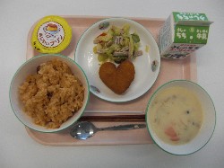 チキンライス、牛乳、ドリア風ソース ハートのコロッケ、イタリアンサラダ 豆乳プリン ![]() |