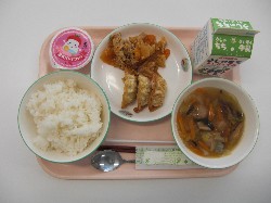 ごはん、牛乳、白菜と肉団子のスープ 揚げぎょうざ、豚キムチ炒め、豆乳パンナコッタ ![]() |