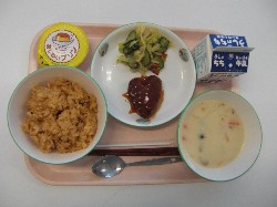 わかめごはん、牛乳、肉じゃが 厚焼き玉子、ほうれんそうのごま和え ![]() |